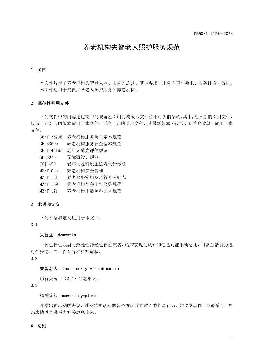 DB50/T 1424-2023养老机构失智老人照护服务规范_金沙娱乐城app