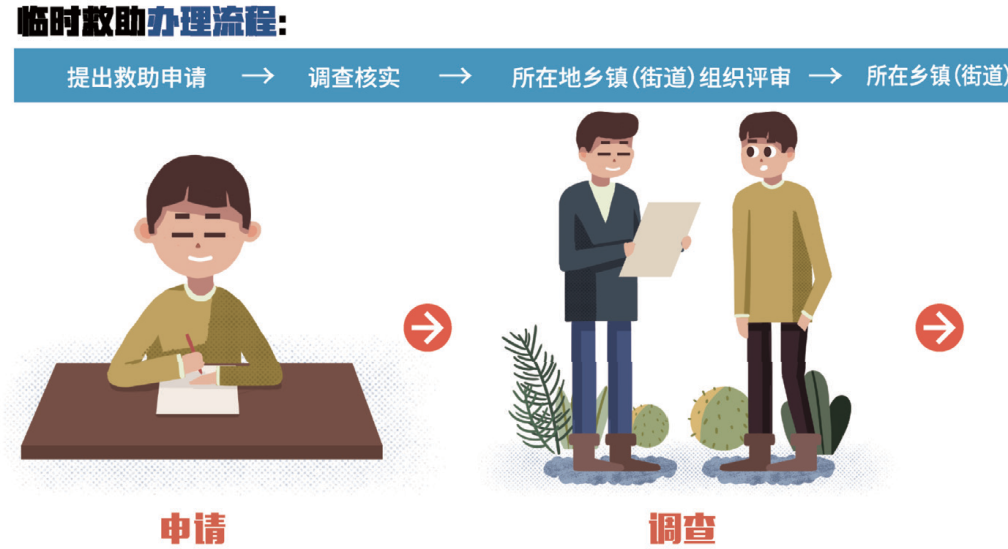 调查。乡镇人民政府(街道办事处)受理申请后,应当在村(居)委会协助下,组织调查人员(每组调查人员不得少于2人)通过信息核查、入户调查、邻里访问、信函索证等方式,对申请人家庭经济状况、人口状况、遭遇困难类型和程度等逐一调查核实,详细核查申请材料以及各项声明事项的真实性和完整性,参加调查人员应在调查结束后,形成调查核实材料并签字,同时应将调查核实材料送申请人签注意见。如有需要,乡镇人民政府(街道办事处)可视情况组织对申请人申报情况和调查结果的真实性进行民主评议。